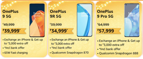 Starting off with the vanilla OnePlus 9 5G, which initially came at a starting price of Rs 49,999. During the Amazon sale, you can get hold of the OnePlus 9 5G with a Rs 10,000 discount. As the device has been priced at Rs 39,999. Moreover, the OnePlus 9R 5G will retail at Rs 34,999. Thus,it is a Rs 5,000 discount from its original price of Rs 39,999. In addition, the priciest of them all is the OnePlus 9 Pro 5G, which was initially at a price of Rs 64,999. But thanks to this festival sale, it will drop under Rs 60,000. Furthermore, the OnePlus 9 Pro 5G will come at Rs 57,999, which indicates a straight Rs 7,000 price cut. There are other offers, such as a provision to exchange an iPhone. And get an additional discount of up to Rs 3,000, also available on Amazon. However, it is clear that all the discounts make the OnePlus 9 series a good buy this festival season.
